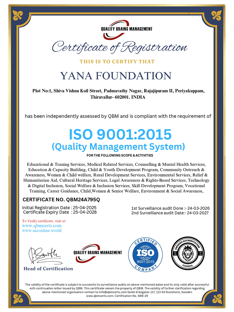 YANA Foundation is a socially driven initiative dedicated to empowering individuals and communities through education, mental health support, and social welfare programs. Guided by compassion and responsibility, we work to create positive change, promote well-being, and support those in need for a better, inclusive future. Through sustainable initiatives and community-focused efforts, we strive to build hope, resilience, and equal opportunities for all.